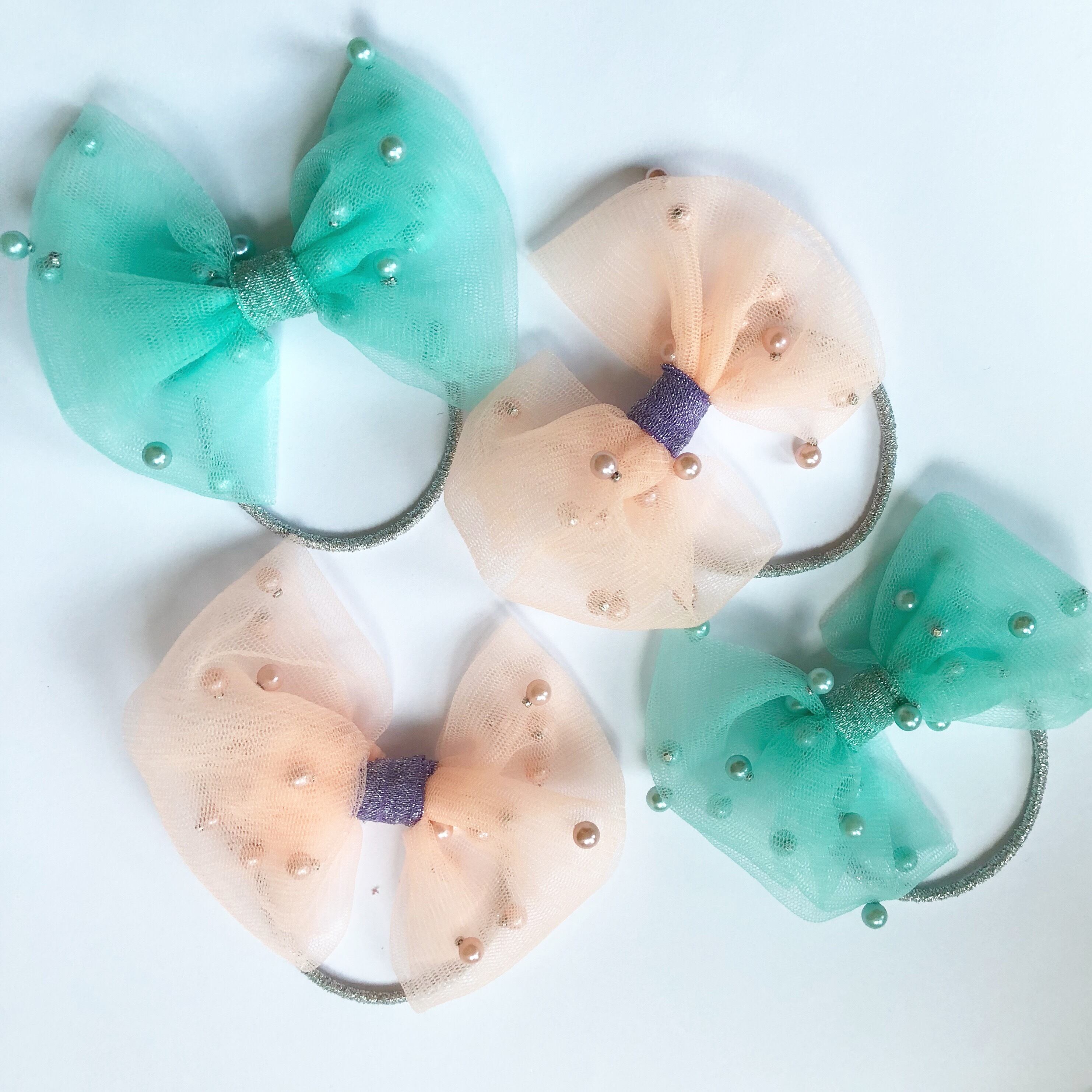 パールがたっぷりついたシフォンの生地を使用したヘアゴムです。
