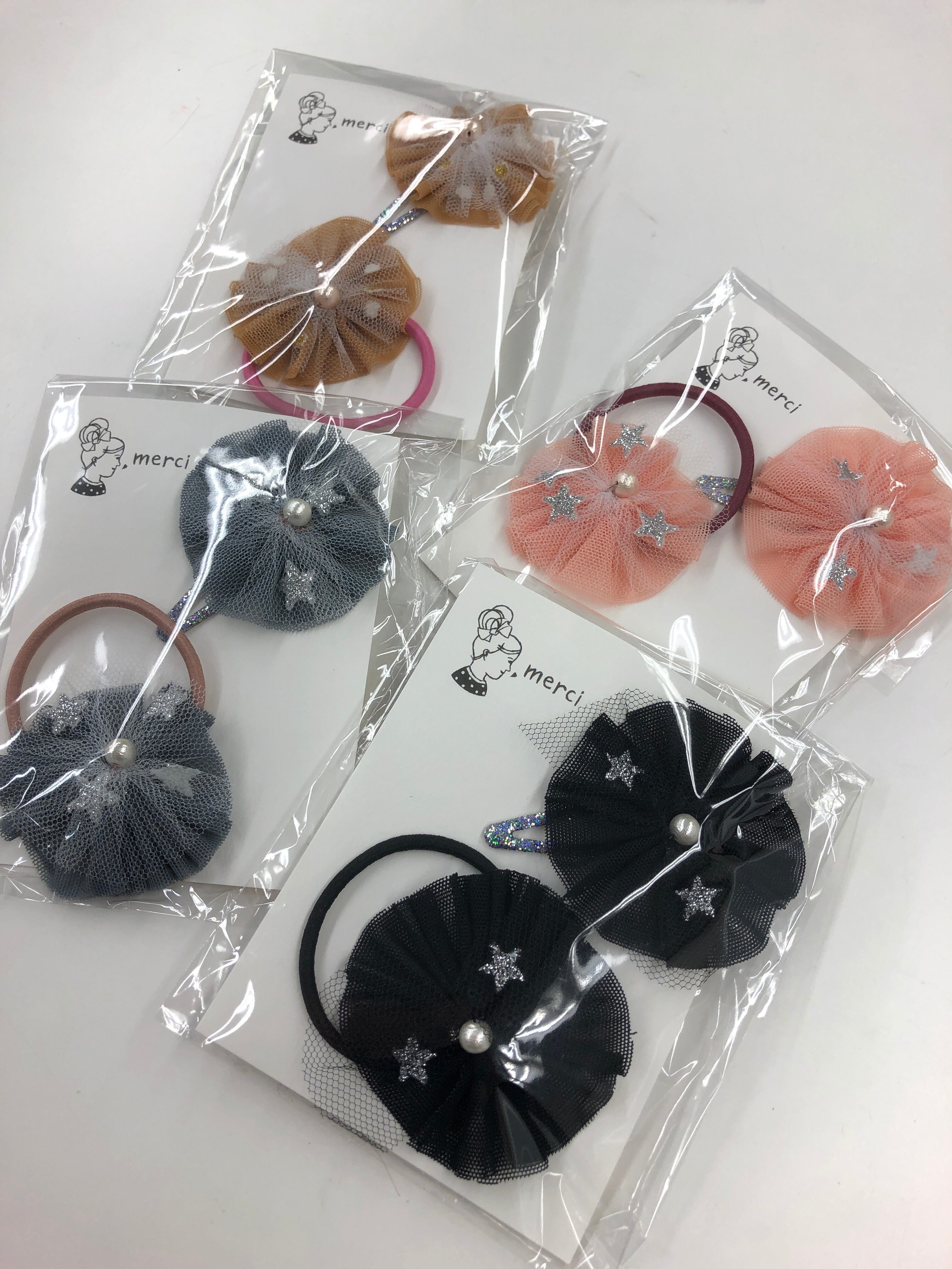 無地のチュールに、おほしさまや、ドットのチュール、そのうえにコットンパールがついています。