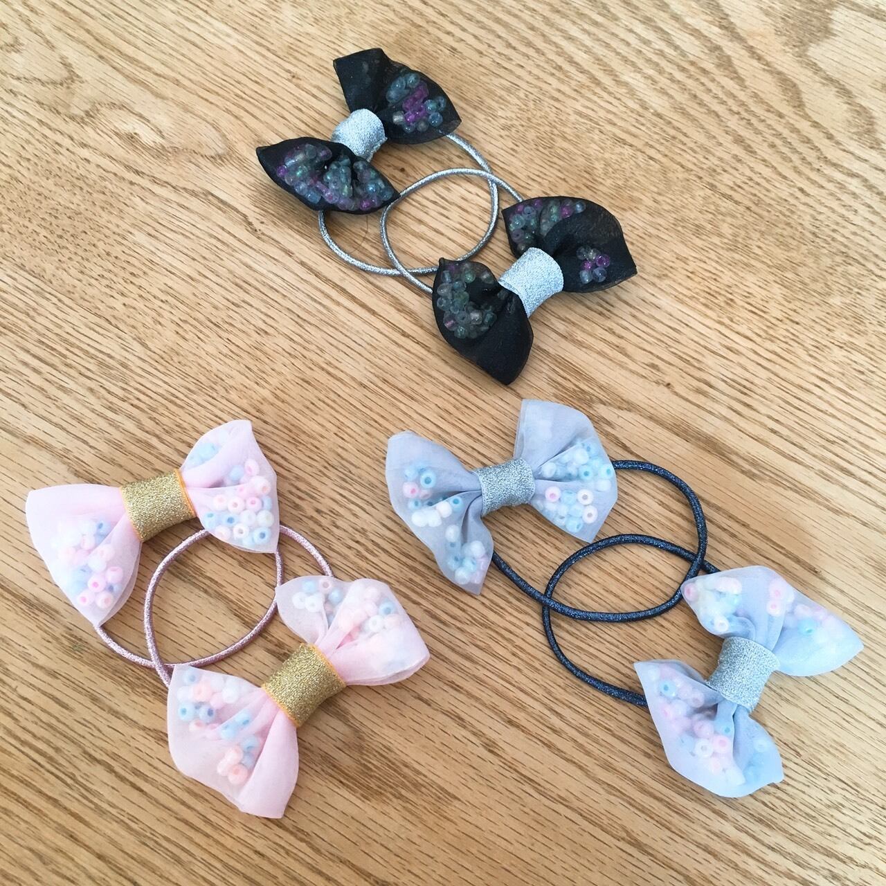 シフォン素材のリボンの中に、ビーズのはいったゴムです。